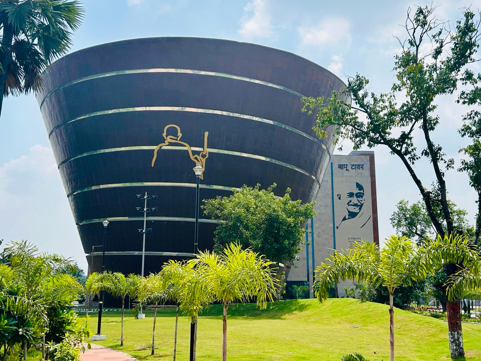 The design and choice of materials are deeply symbolic, connected to Gandhiji’s teachings and philosophy. The inverted conical shape of the tower is rich in symbolism, indicating that Gandhiji’s teachings and principles are becoming increasingly relevant over time. Just as the inverted cone expands with height, it represents the growing influence of Gandhiji’s philosophy and its necessity in the modern world.