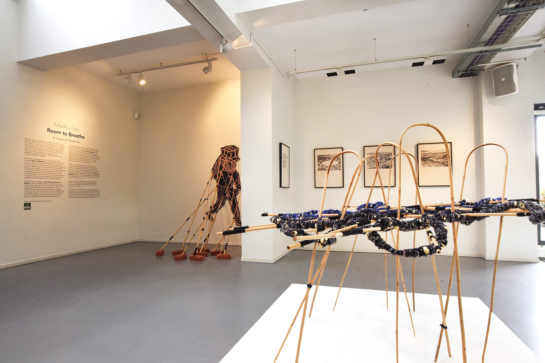 In his work, the human body often establishes an improvisational relationship with objects and sculptural elements in the space. His work involves spaces, in both a narrative sense and as a site of memory, to re-narrate historical events as a way of plotting connections between the particular and the universal. Madhu adapts aspects of material culture and uses methods from anthropology and allegorical fiction as conceptual tool, exploring linguistic devices and imagery with a sense of irony and paradox.