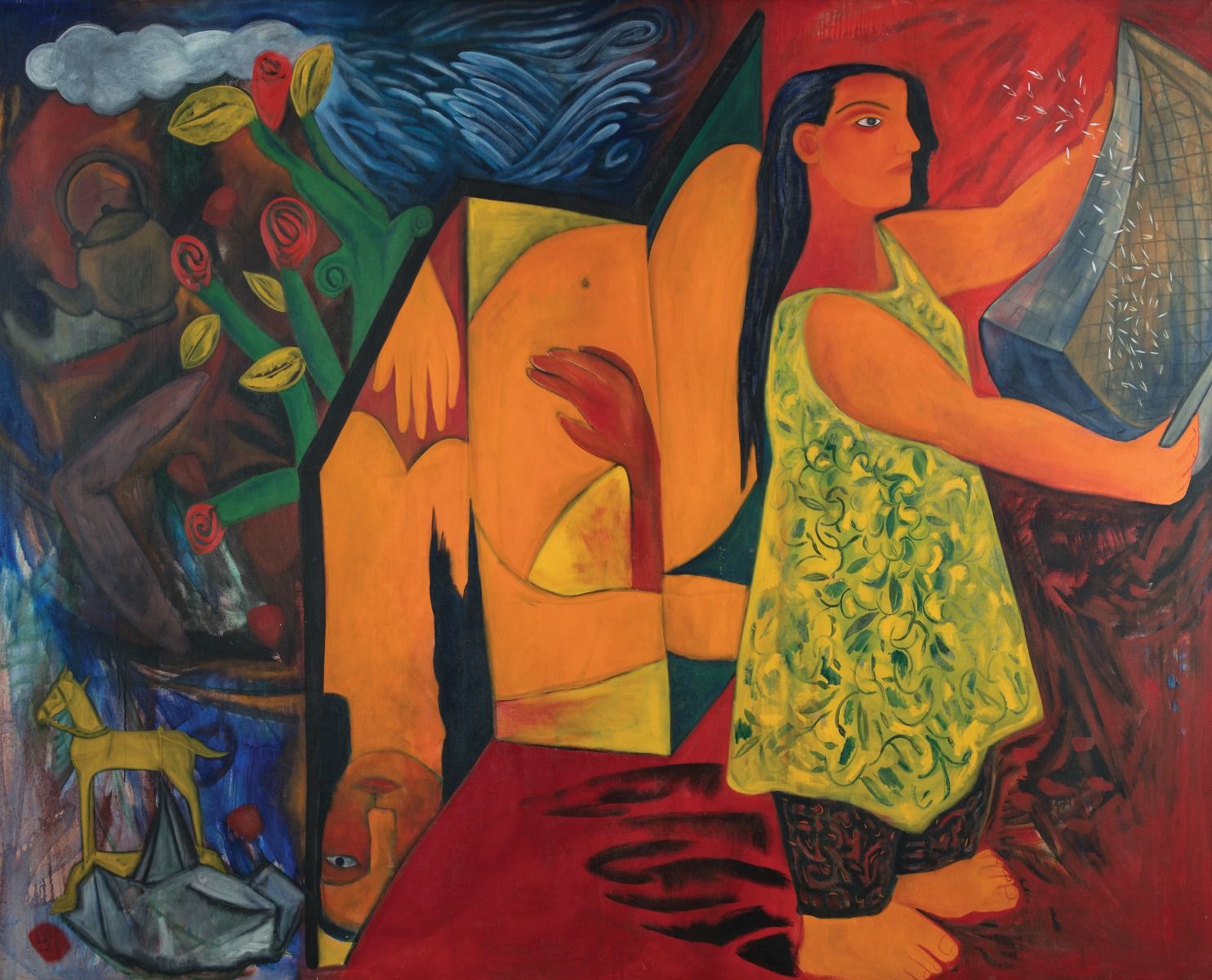 Working across mediums, Rodwittiya has created allegorical works that are like psychological dialogues on socio-political issues, concerning topics such as alienation, belonging, acceptance, as also experiences of being a woman in contemporary society. All of this is deciphered through her accumulated observations of the past tempered with her beliefs and values. Her protagonist has often been a woman who is depicted absorbed in her daily routine. Rodwittiya’s colour palette is bright and cheerful and she uses symbols and motifs metaphorically.