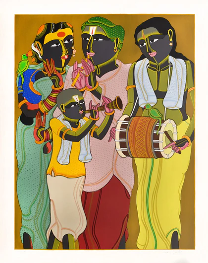 Born in 1942 in Boorugupalli, Andhra Pradesh, Thota Vaikuntam is a unique painter who captures the rustic beauty of rural Telangana. He studied at the College of Fine Arts and Architecture, Hyderabad, where he completed his diploma in 1970. He won the Lalit Kala Akademi Fellowship to study Painting and Printmaking at the Faculty of Fine Arts, M.S University, Baroda, in 1972 under the guidance of Prof. K.G. Subramanyan, after which he toyed with the idea of abstraction.